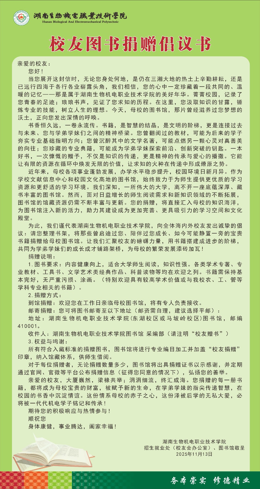 湖南生物机电职业技术学院校友图书捐赠倡议书